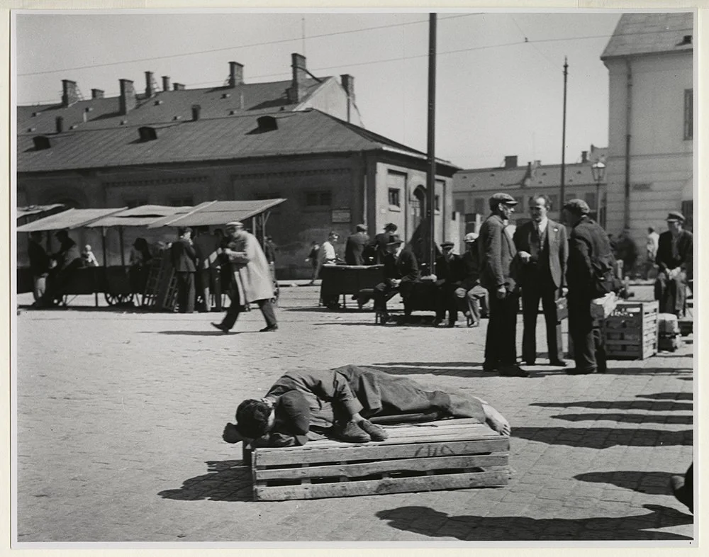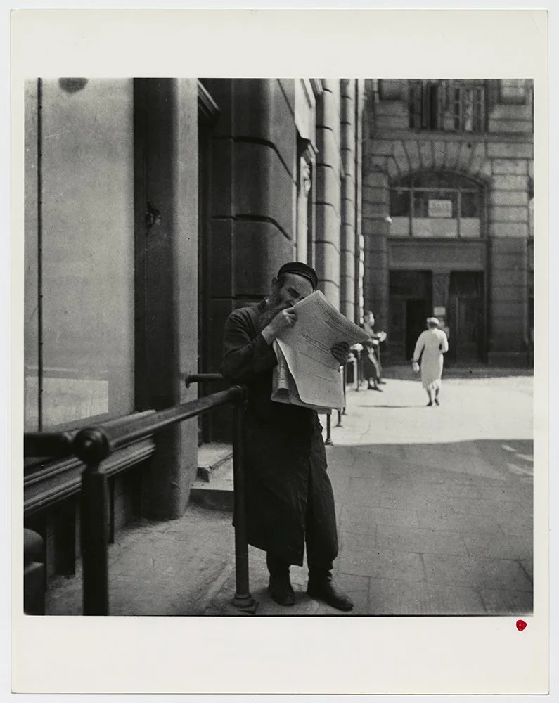 His eyes hypnotized by a Yiddish rag, one of a dozen then hawked in Warsaw, some with photos, one featuring a cartoon of a German clown. He’s out of tune with what’s going on, what with that porter’s cap and coat flapping at his ankles. A woman in smart Sunday togs saunters by and he doesn’t cop a glance. His disregard forebodes—but who foresaw the rage answering a Judenfrage?